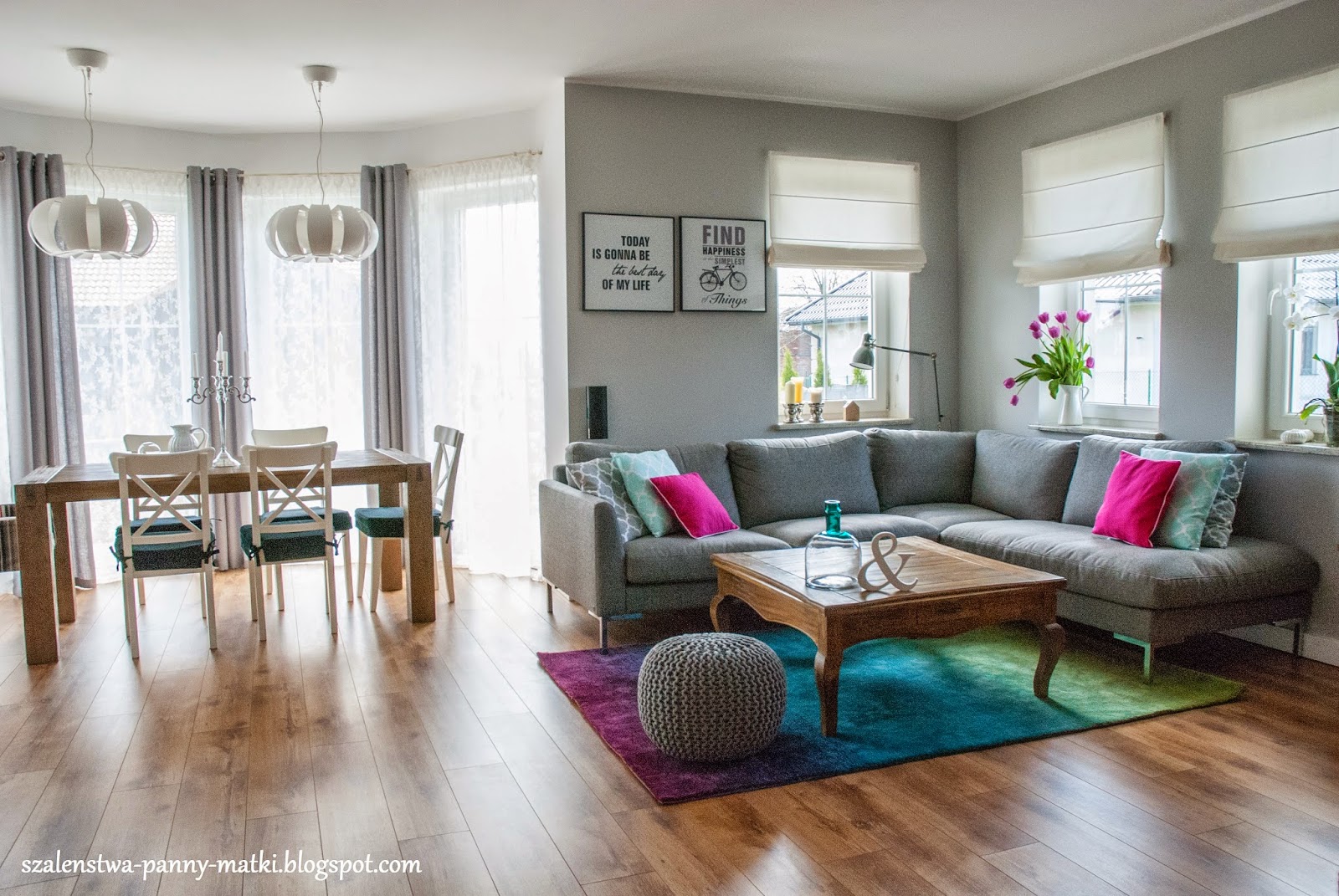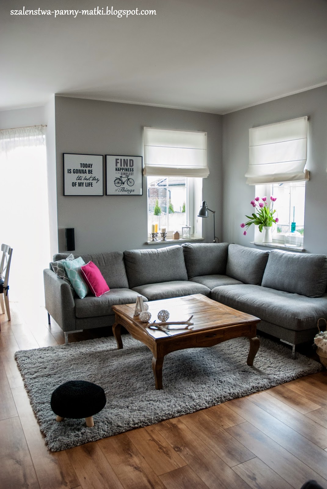 Jeśli padłoby pytanie który wybrać spośród tych dwóch to szary zdecydowanie się lepiej prezentuje w tym akurat wnętrzu. Wystarczą te poduszki, kwiaty, dodatki żeby wnętrze ożywić. A bazą w postaci podłogi, dywany, narożnika i zestawu w jadalni pozostawiłabym właśnie taką jaką jest.