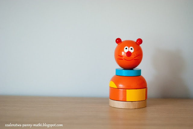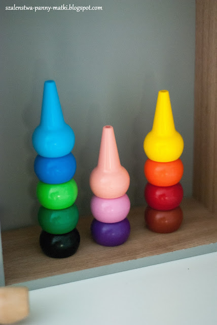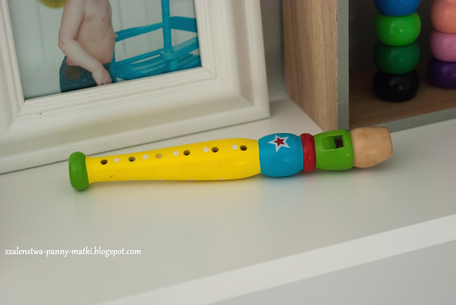 Drewniana układanka, flet i głowa LEGO to dodatki, które Antoś stosuje do zabawy tak samo jak kredki.
