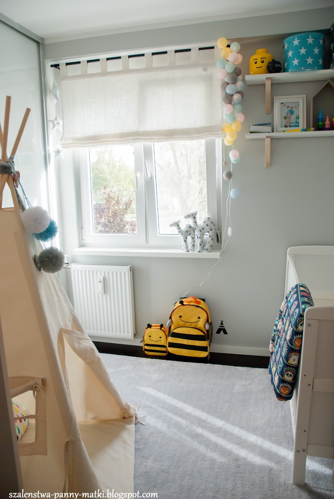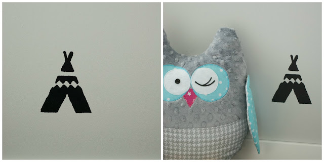 Na ścianie pomalowanej farbą Beckers LIGHT GREY, która chyba nigdy mi się nie znudzi mamy jak to mówię Synowi tipi dla myszek, wykonane dzięki szablonom, które otrzymaliśmy w prezencie od STENCILS, których szczerze Wam polecam. Malowanie poszło ekspresowo, bez problemów i z użyciem farbek zakupionych swego czasu w LIDLU.
