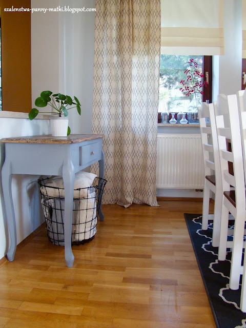 Konsolka kosztowała 120 zł i została przemalowana z przecieranego drewna na kolor szary przy jednoczesnym pozostawieniu naturalnego blatu.