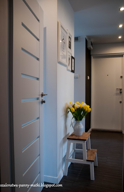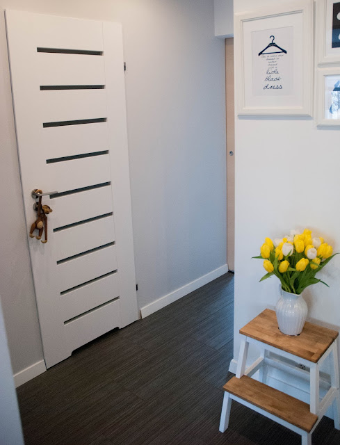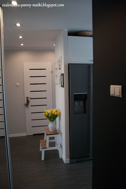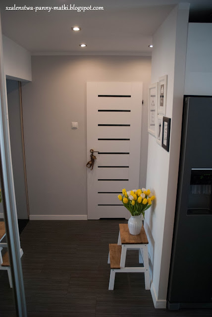 Drzwi poza wyciszeniem zmieniły totalnie wygląd korytarza, postanowiłam przemalować ścianę na której są one umieszczone na kolor taki sam jak w salonie, a ścianę przy drzwiach wejściowych na kolor czarny. Wykonałam to przy użyciu tablicówki.