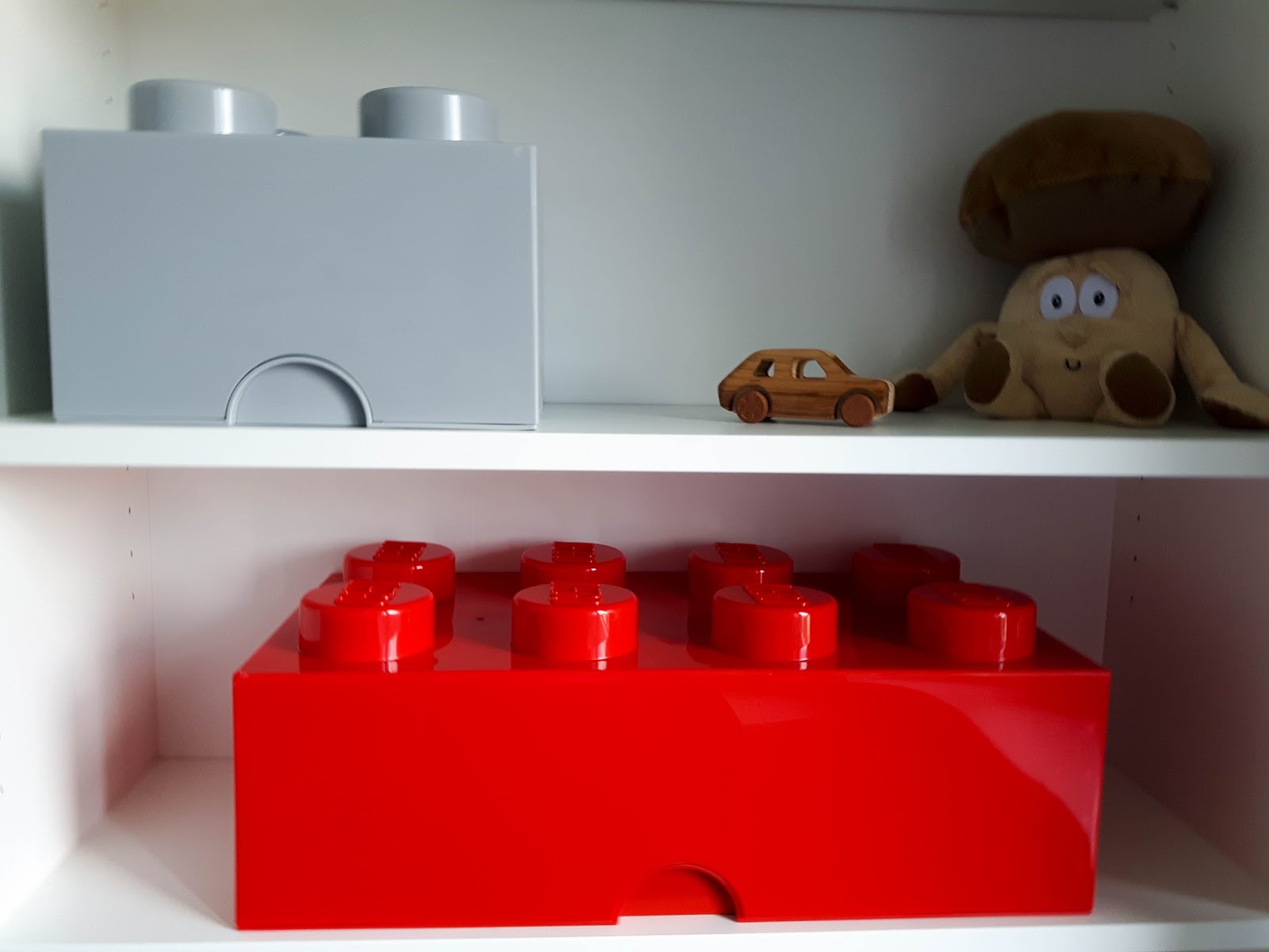 Przedstawione poniżej pudełka LEGO, są idealne na przechowywanie małych zabawek, a duże auta najlepiej chować pod łóżko(ja u siebie do perfekcji opanowałam wykorzystywanie tej przestrzeni i chowam tam choćby dywan z ulicami z HM, z którego korzysta mój Syn podczas zabawy).
