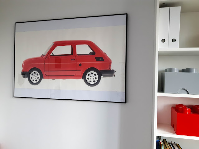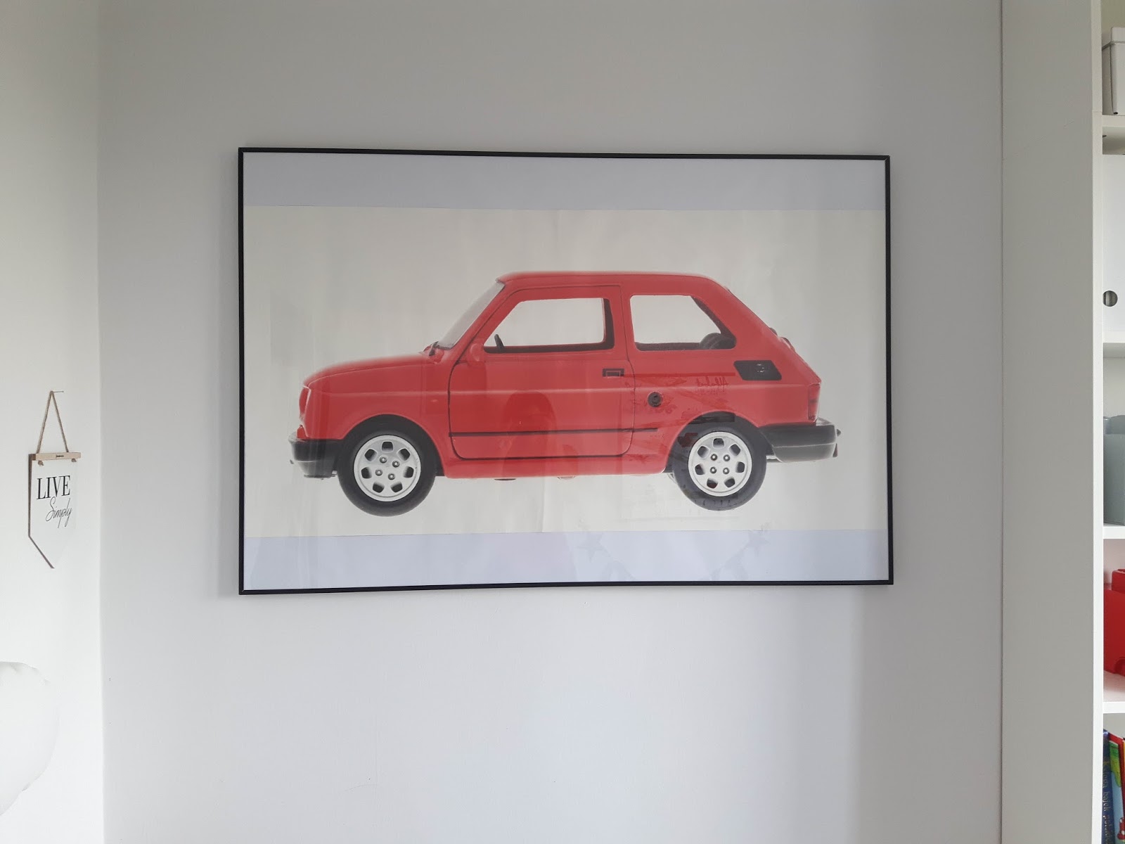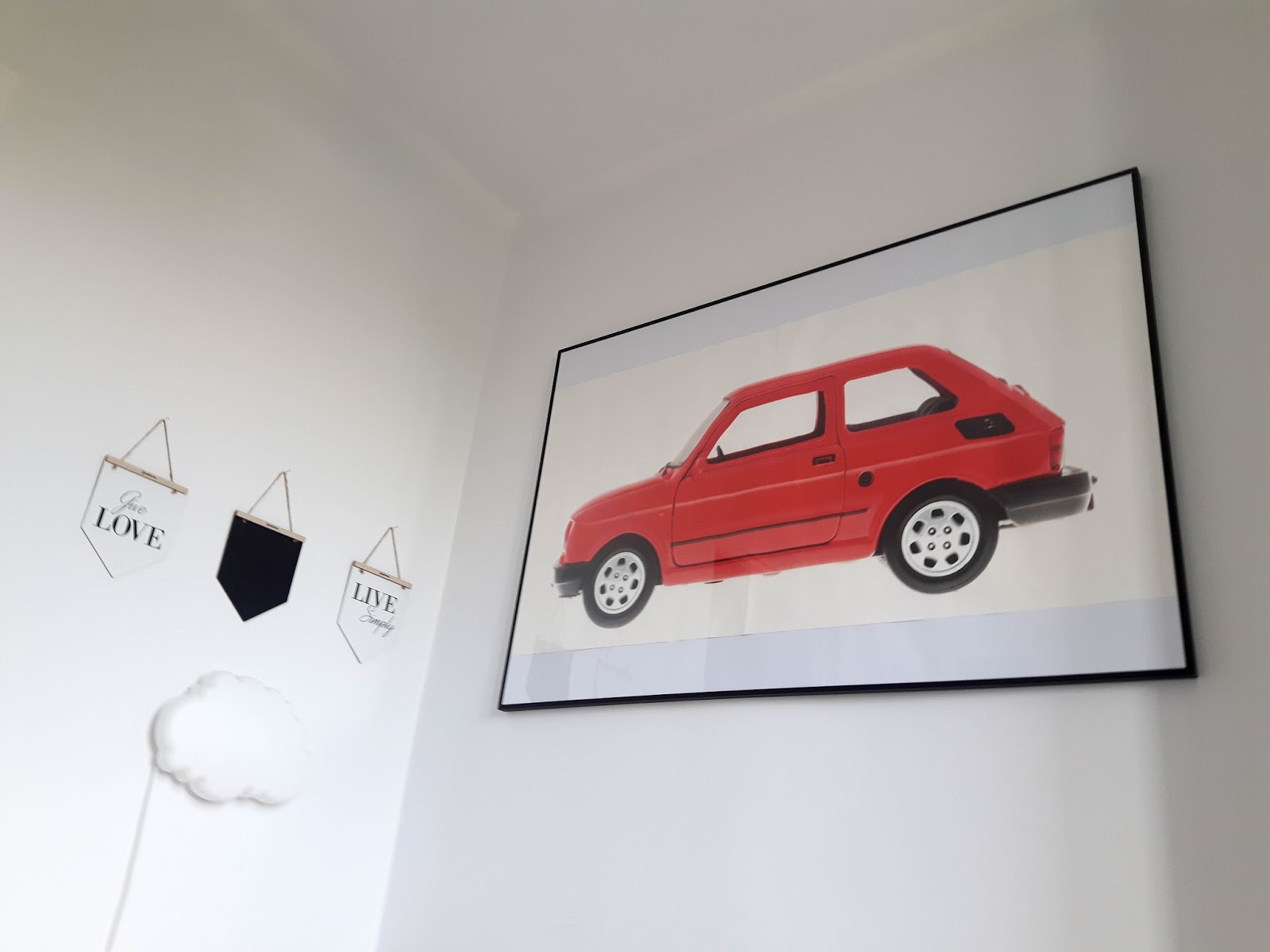 Naklejkę/plakat z maluchem oderwano ze ściany i trafiła ona do ramy, dodatkowo dekorację uzupełniły takie gadżety: