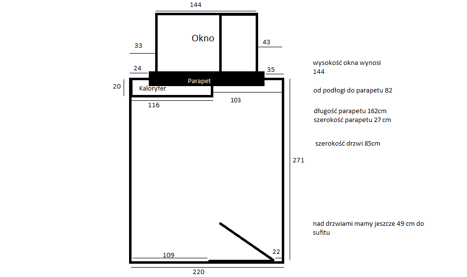 Powyżej rzut wymiarów pokoju, a poniżej zdjęcia pokoju sprzed transformacji.