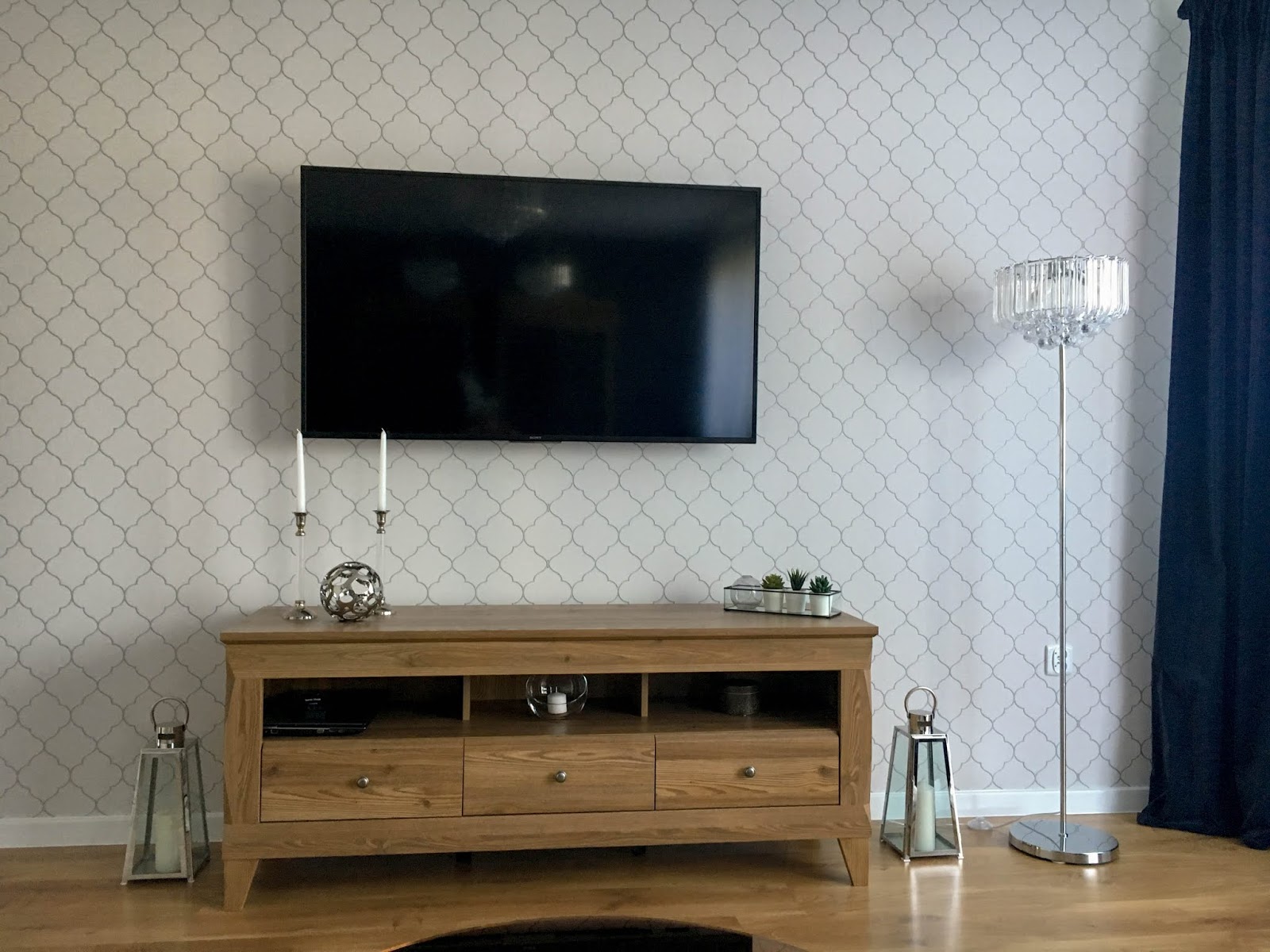 ściana gdzie TV-na wprost grafitowej pokryta została tapetą:
