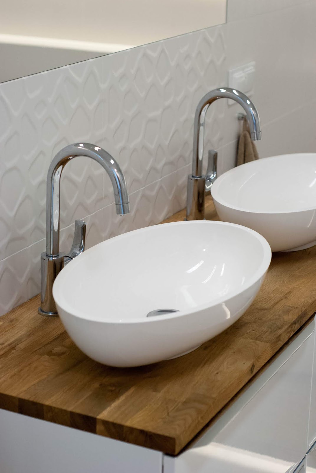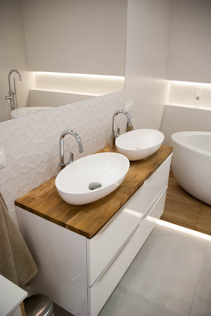 szafki z drewnem na blatach od umywalek. Wszystko miało stanowić spójność, aby