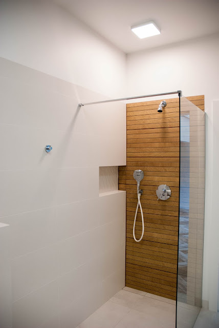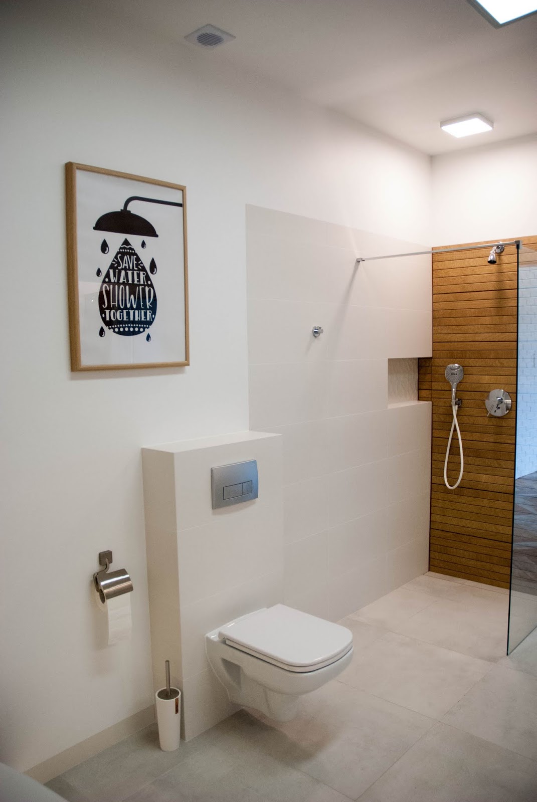 W łazience na górze zaplanowana była tylko kabina prysznicowa, całkowicie zamykana i płytki brodzik, tu miało być szkło i odpływ typu liniowego.