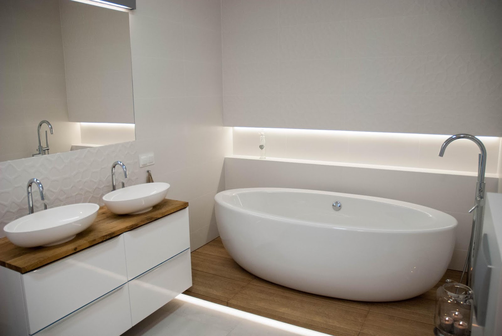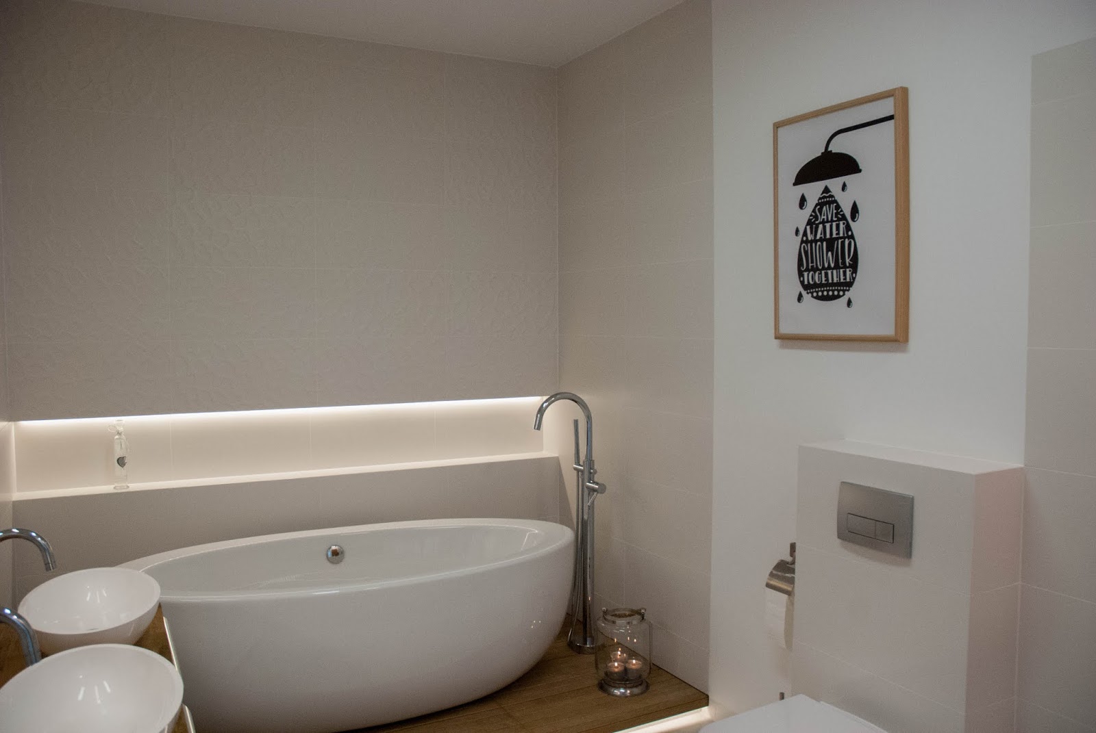 WANNA wolnostojąca to była moja pierwsza myśl i wiedziałam, że będzie stanowić ona bazę w tym pomieszczeniu i wokół niej rozplanuję pozostałe elementy wyposażenia pomieszczenia.