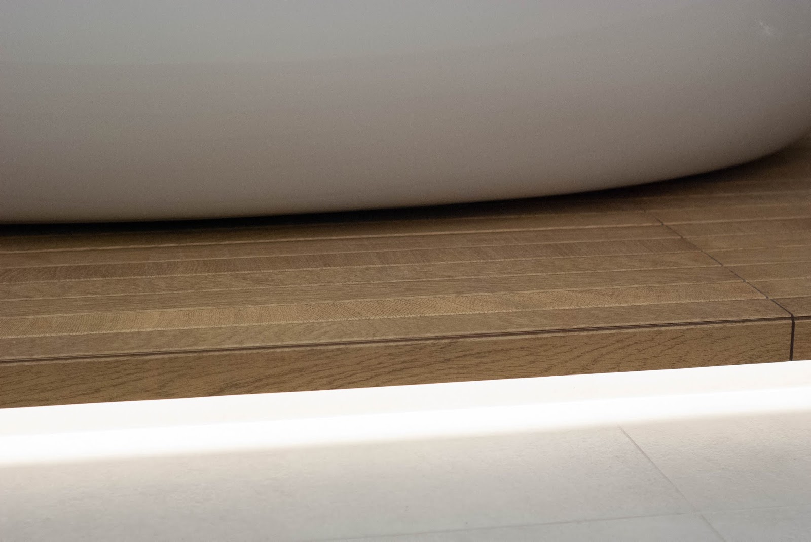 listwą led i innym kolorem płytek, który znajduje się również w strefie