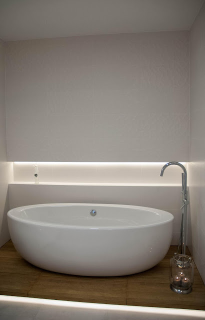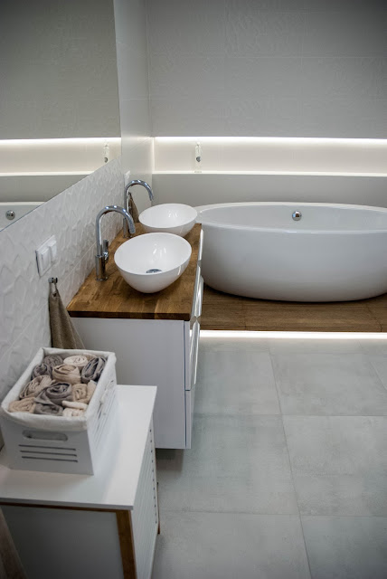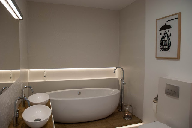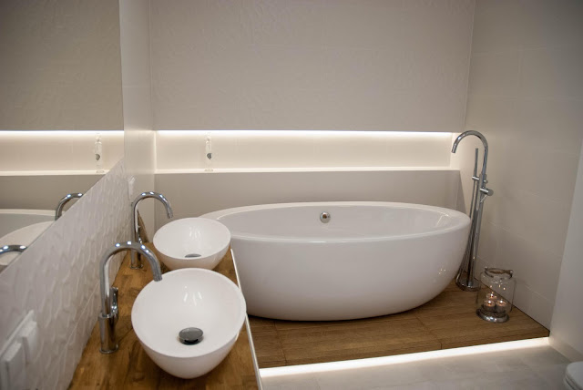 wannę postanowiłam ustawić na stopniu, który jak i wnęka na kosmetyki jest podświetlony